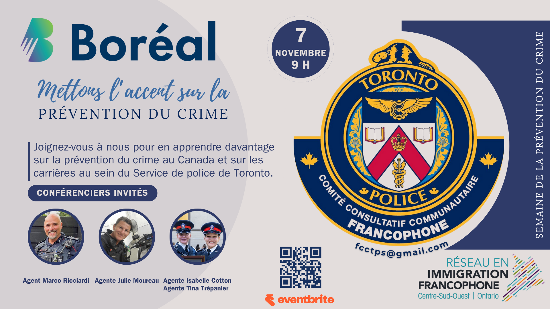 Joignez-vous à nous pour en apprendre davantage sur la prévention du crime au Canada et sur les carrières au sein du Service de police de Toronto. Dans le cadre de la Semaine de prévention du crime et de la Semaine Nationale de l’Immigration Francophone, le Comité Communautaire Consultatif Francophone de la Police de Toronto, et le Coll`ège Boréal vous proposent une journée en français pour mettre l’accent sur la prévention du crime. Conférencier·ère·s invité·e·s: