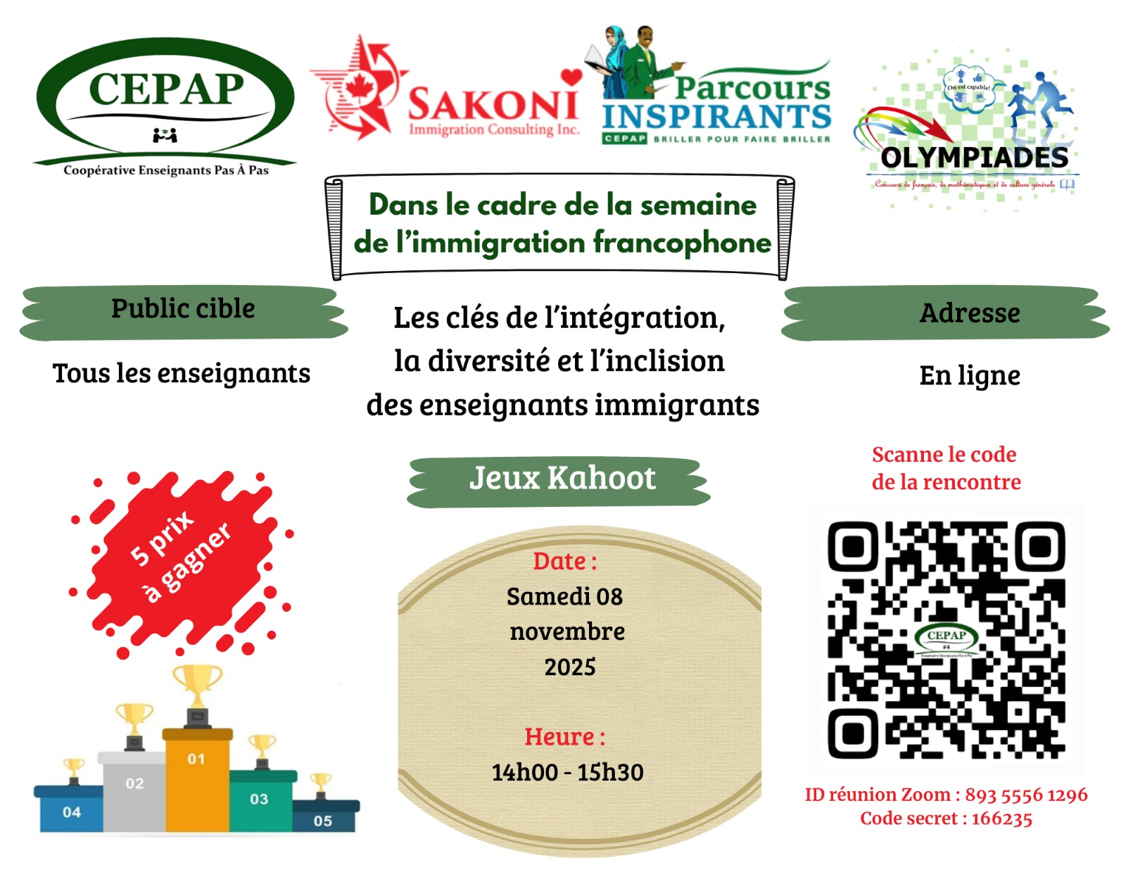 Tous les enseignants sont invités le samedi 8 novembre de 14h00 à 15h30 à participer à ce jeu Kahoot offert par le CEPAP dans le cadre de la semaine nationale de l’immigration francophone.