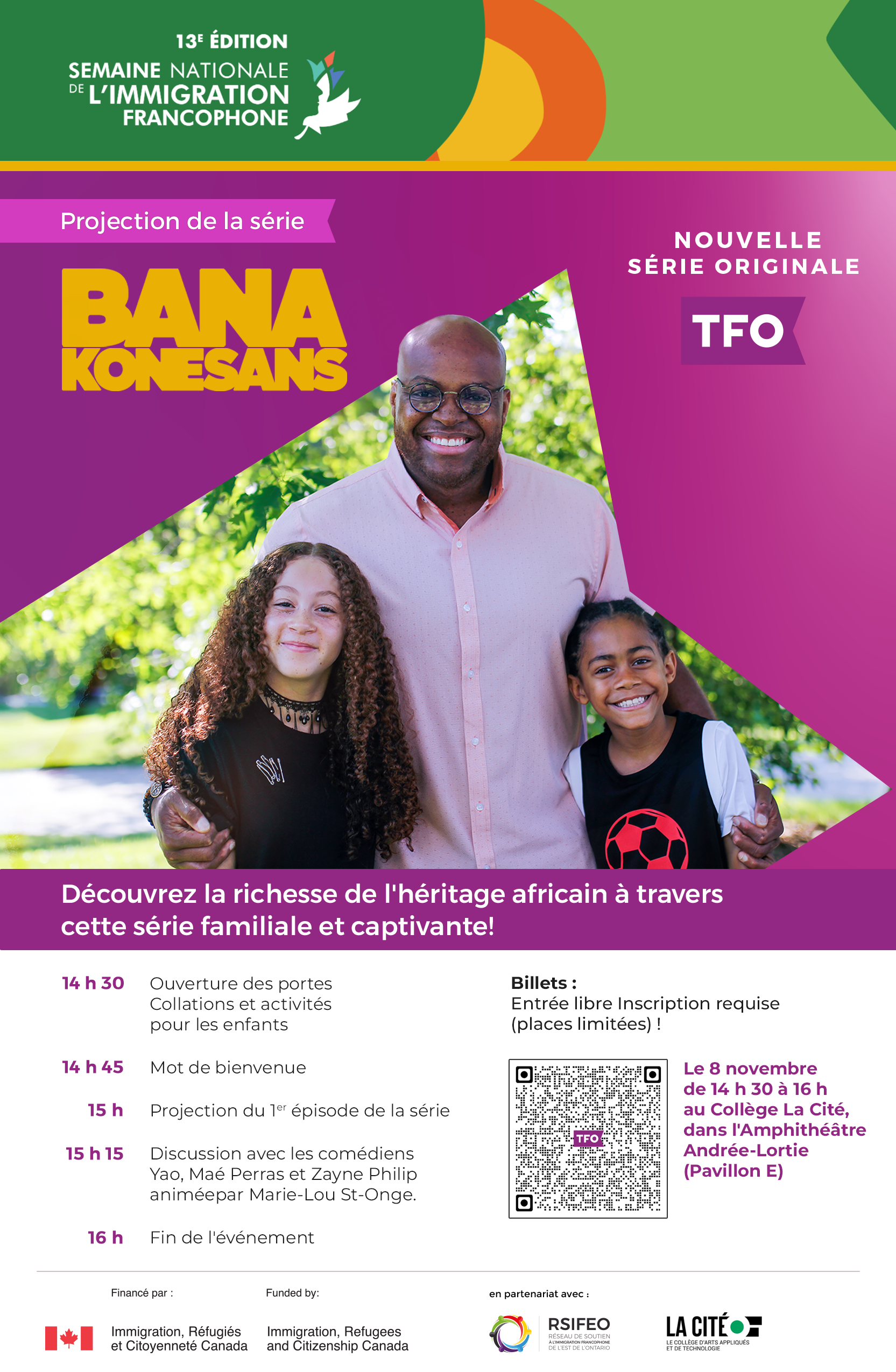 Pour clôturer la semaine nationale de l’immigration à Ottawa, cette année, TFO et RSIFEOvous invitent à découvrir la richesse de l’héritage africain à la projection spéciale de la nouvelle série BANA KONESANS suivie d’une discussion avec les vedettes de cette série inspirante produite par TFO et Moi & Dave!